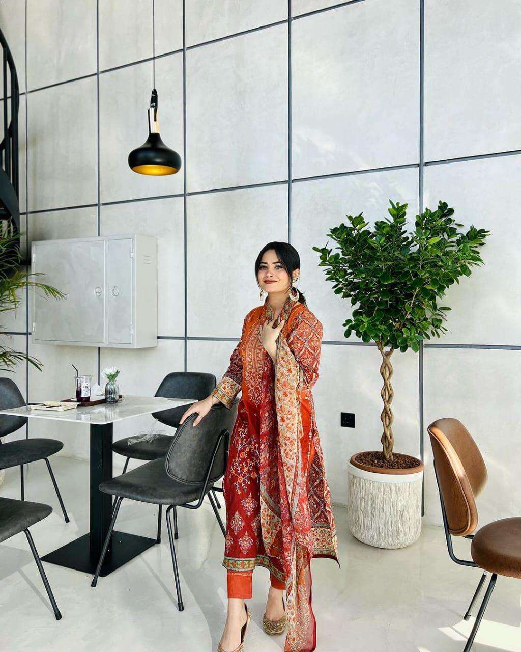 top:- pure lawn print with exclusive heavy self embrodery bottom :- semilawn duppta:- pure printed lawn cotton box pallu |